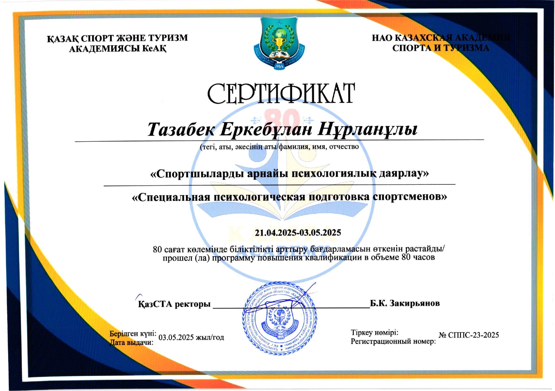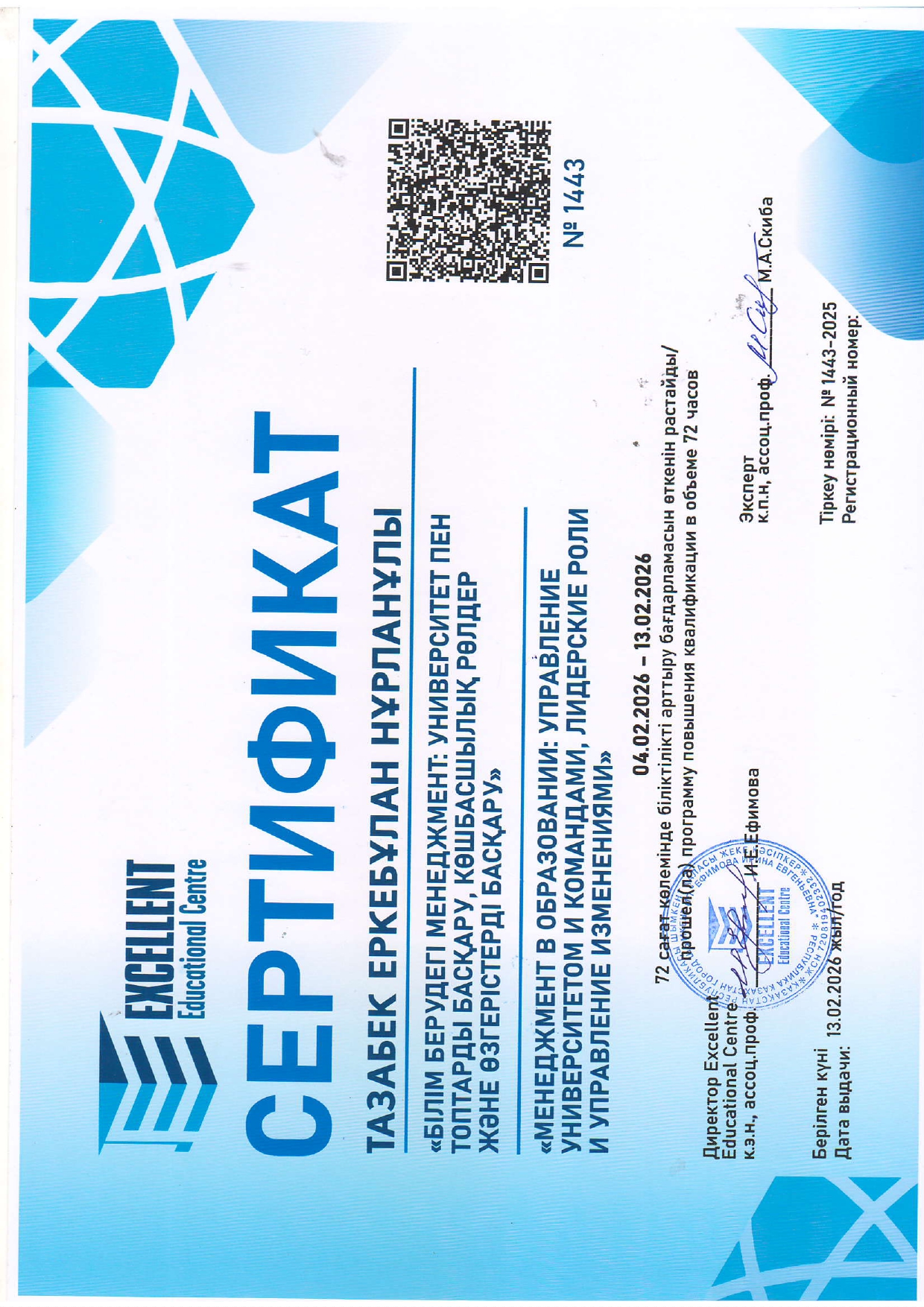 Тазабек Еркебұлан Нұрланұлы біліктілігін арттыру
