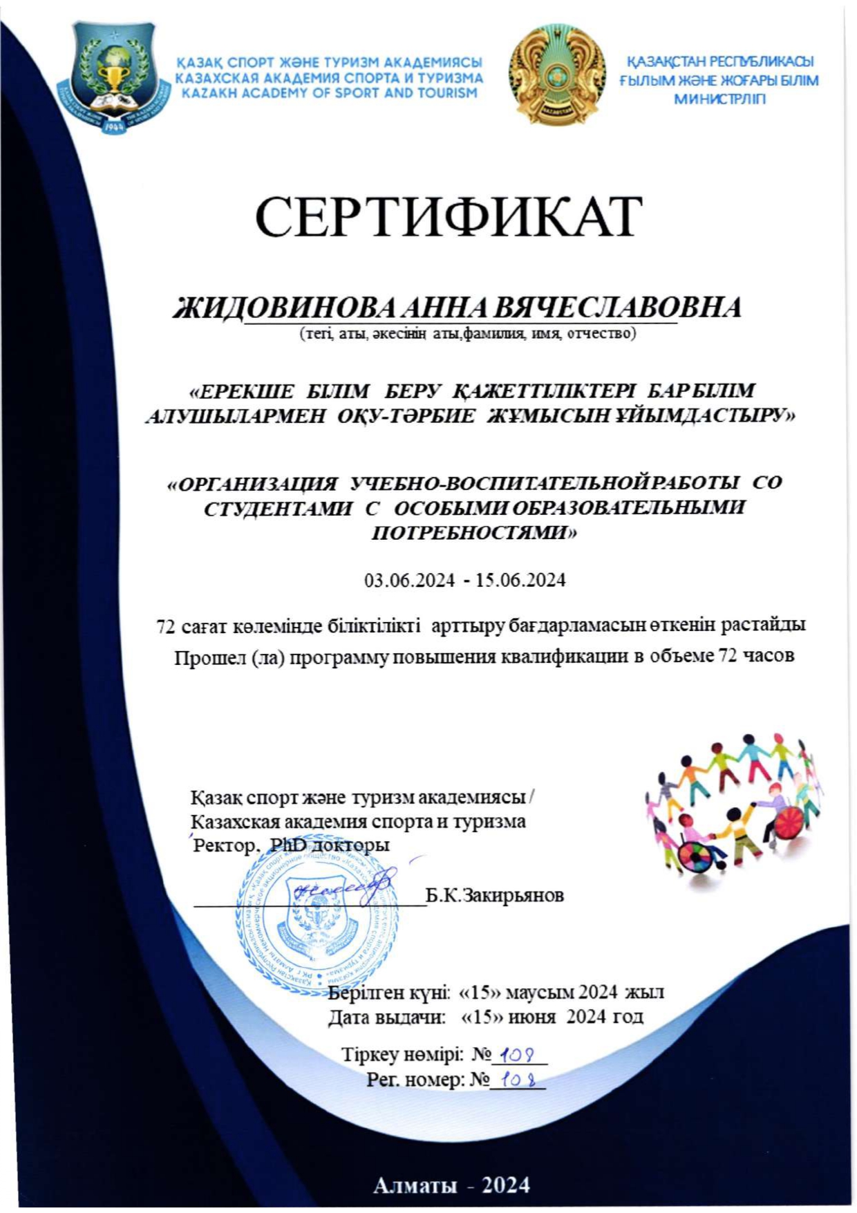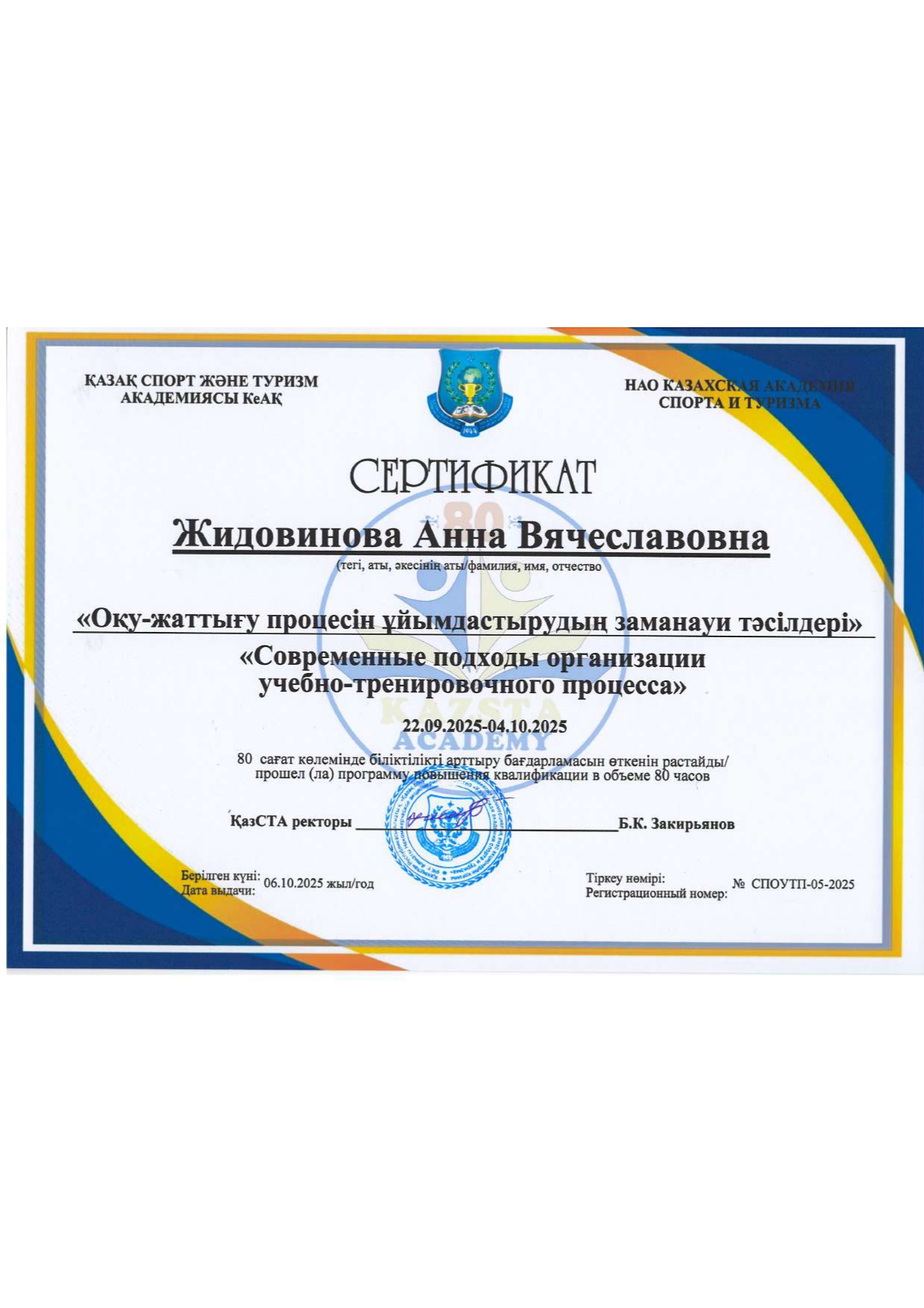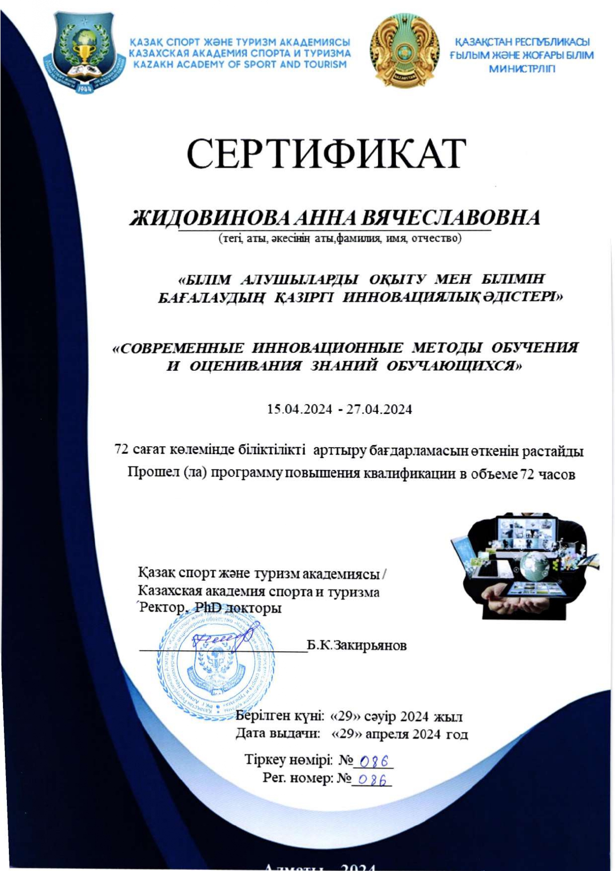 Анна Вячеславовна Жидовинованың біліктілігін арттыру