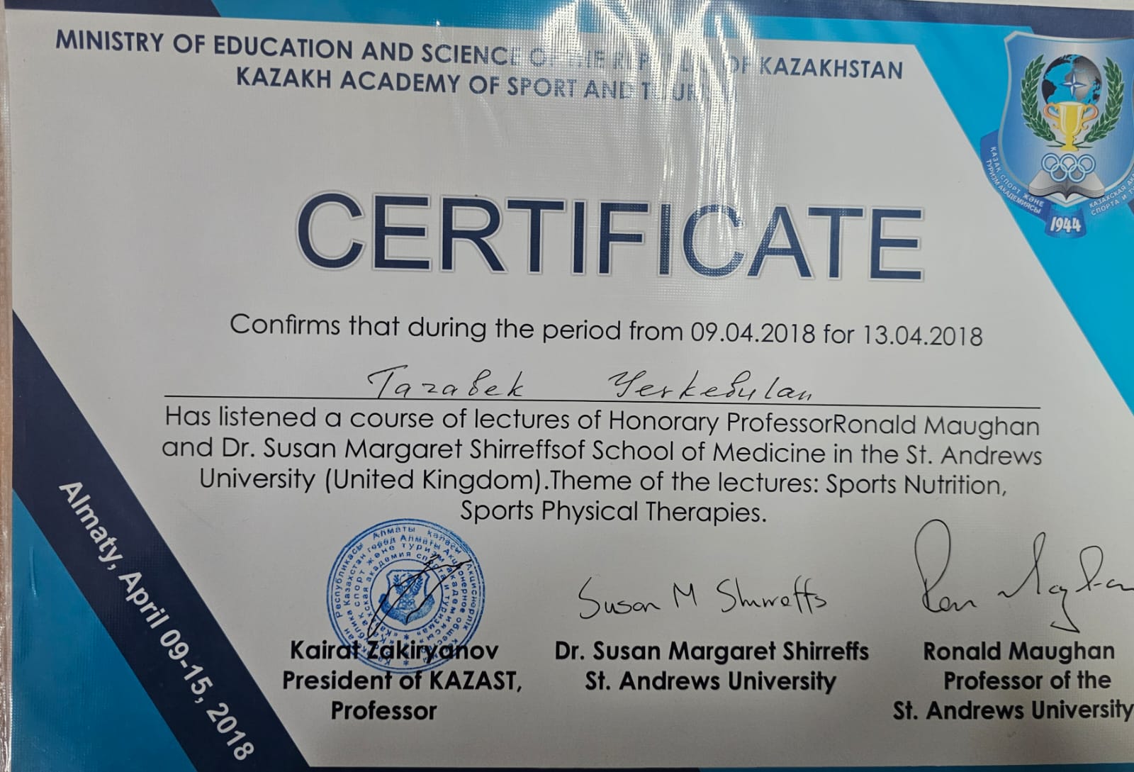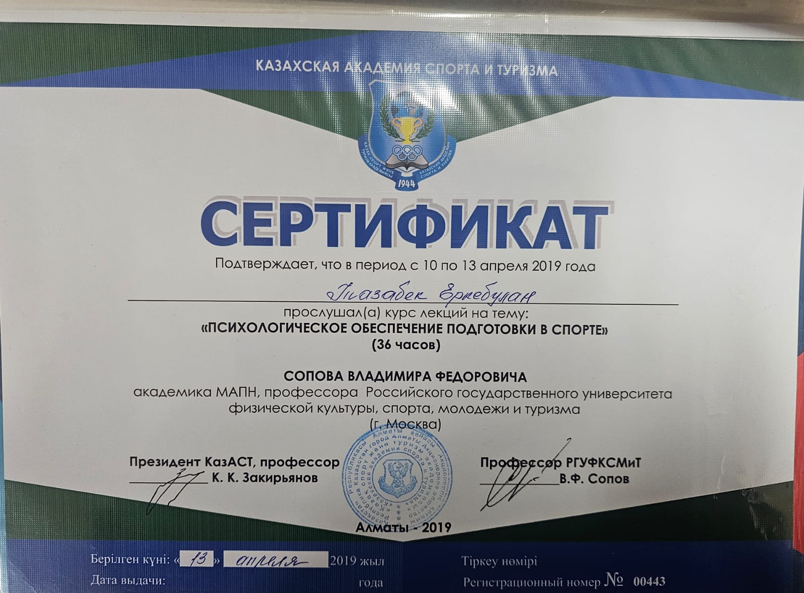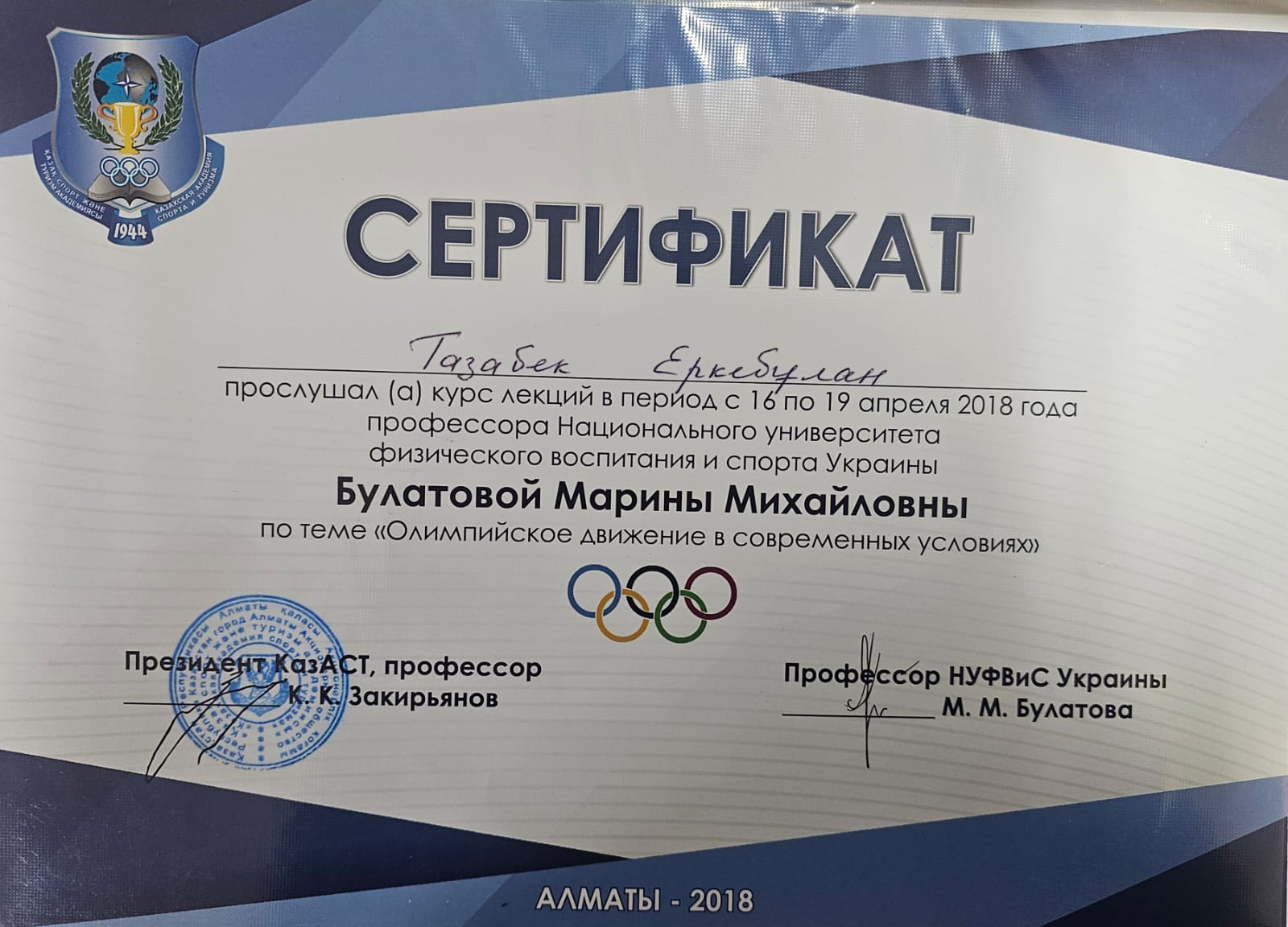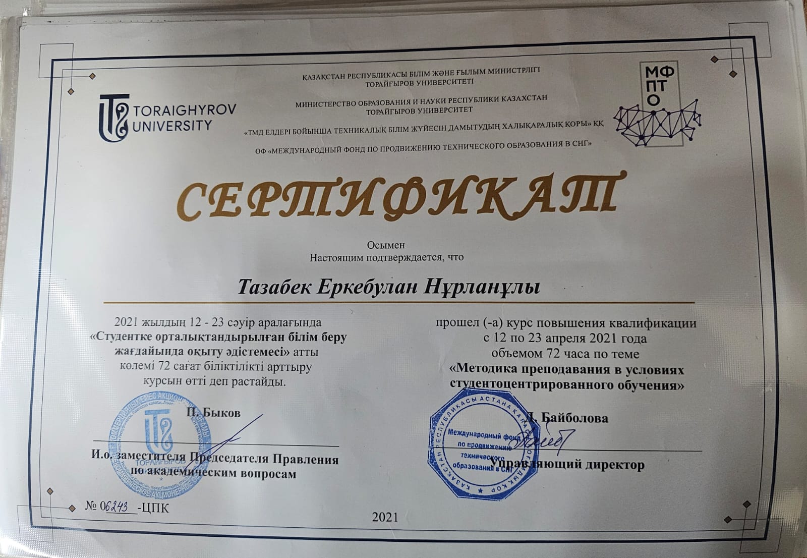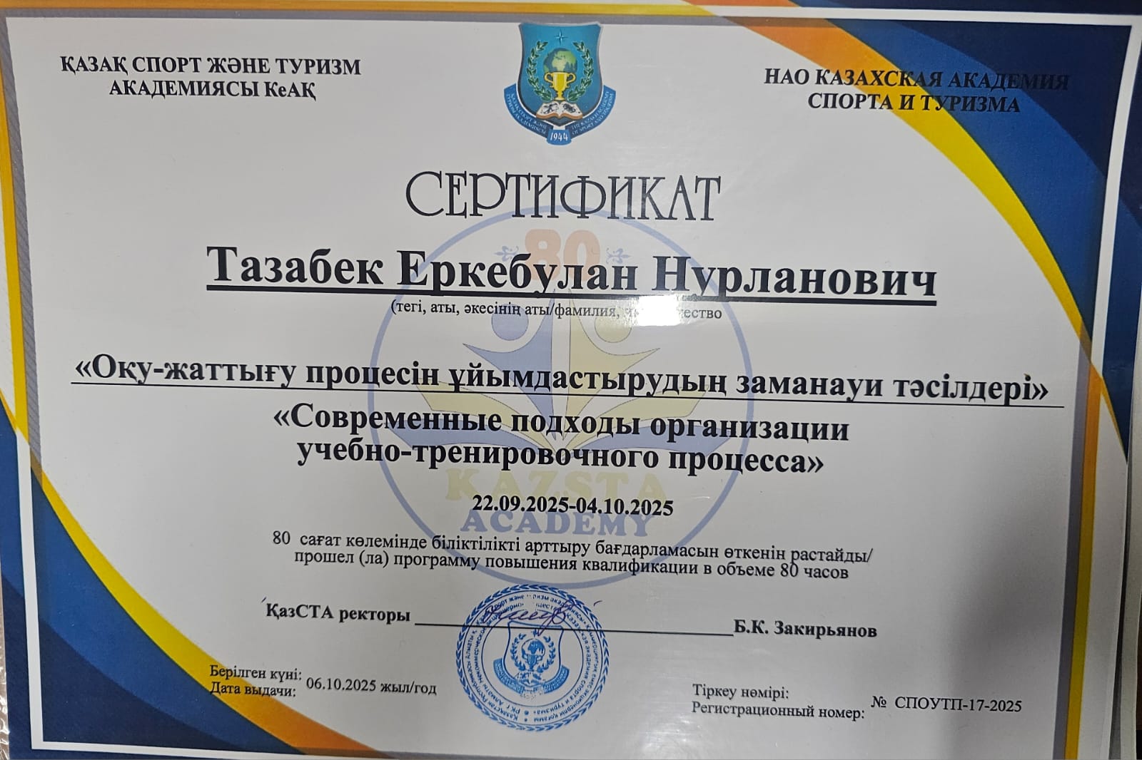 Тазабек Еркебұлан Нұрланұлы біліктілігін арттыру