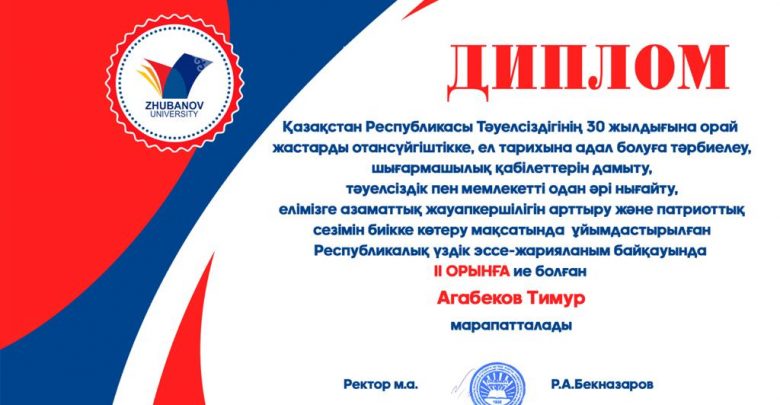 In April 2021, the Republican Essay Contest for the best coverage of the 30th anniversary of Independence of the Republic of Kazakhstan was held as part of the implementation of the main goals and objectives outlined in the independent state. The competition was organized by the Department of Social Affairs and Youth Policy and the Faculty of Philology of Aktobe Regional University named after K. Zhubanov.